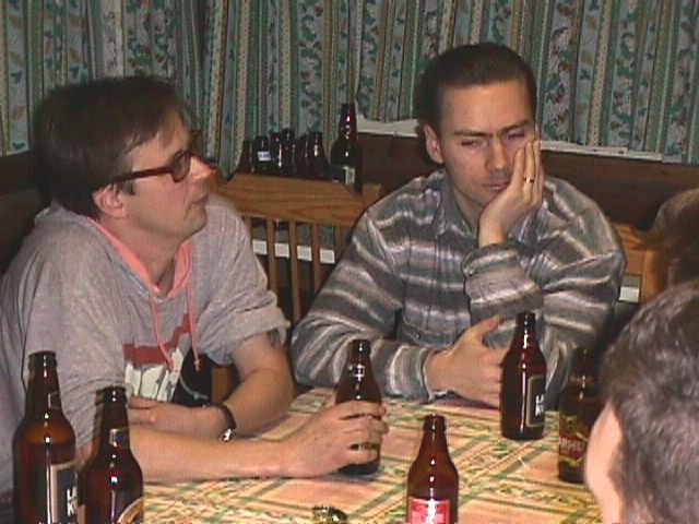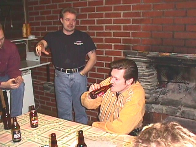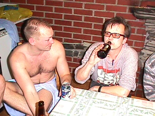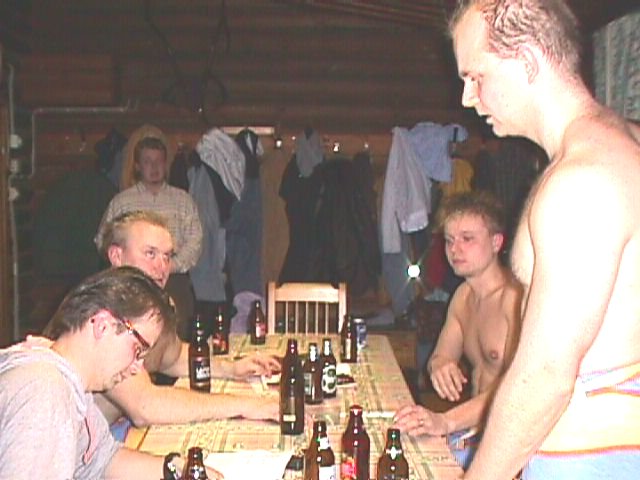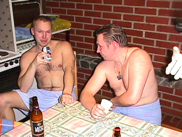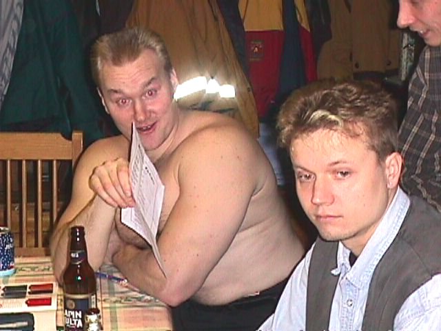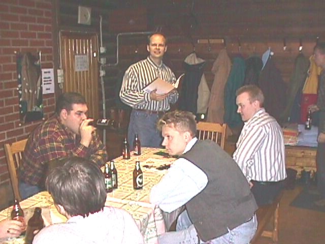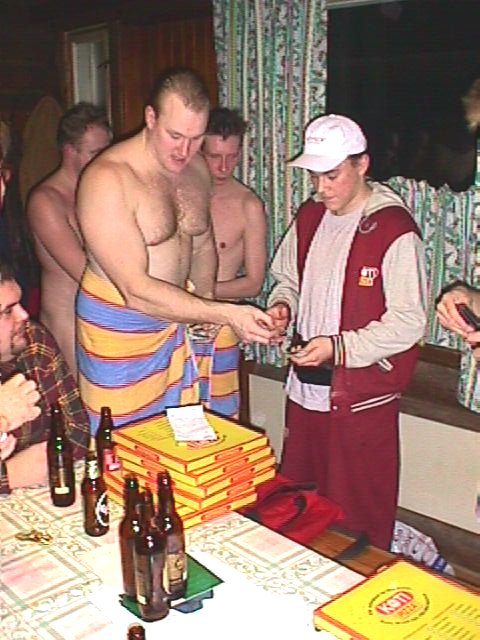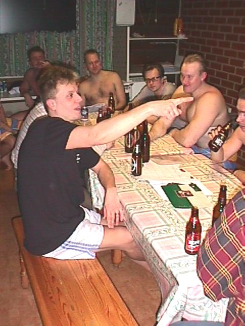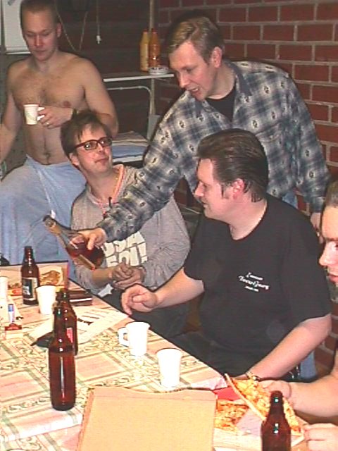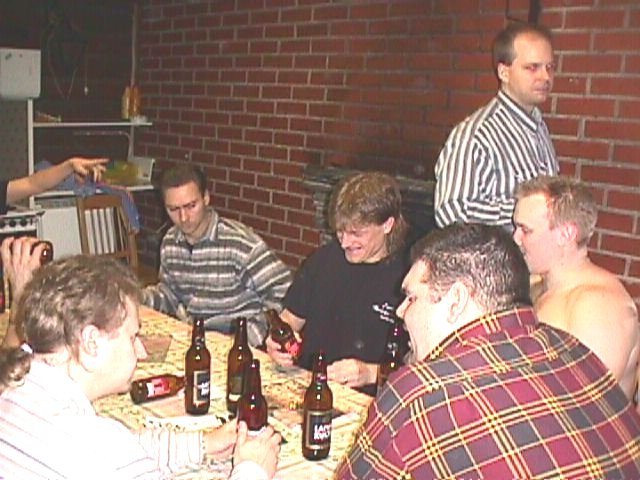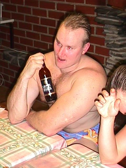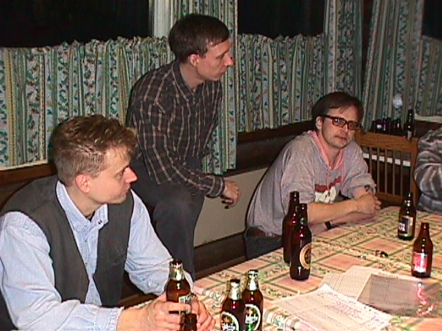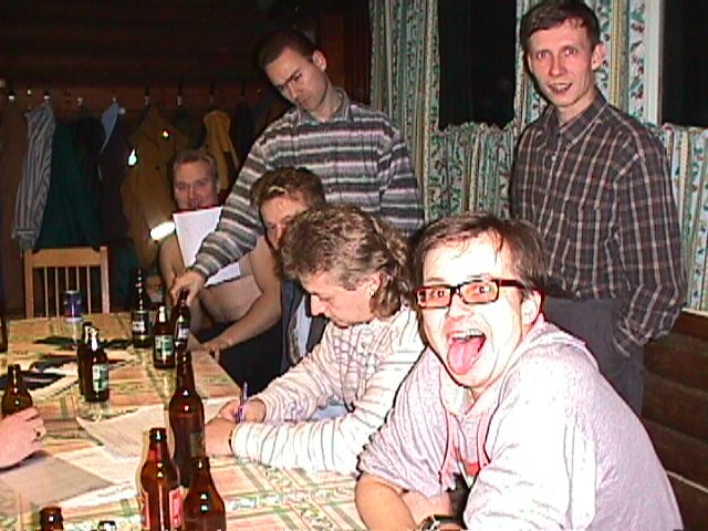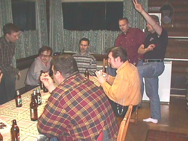 Kokouksen ensimm�isen virallisen osan aikana mietittiin vaatetilauksia... Eniten keskustelua aiheutti uuden j�senen ottaminen mukaan toimintaan Kuva 1 , -2 ja -3. Kimi & Tapi , Timppa & Kimppi , K�rri , Mako & Kaitsu , Hema & Juki sek� Tapi & Artsi joutuivat tiukkaan miettim��n BG:n j�senm��r�n kasvattamisen seurauksia. Tapi kertoo mielipiteens�. Timppa , Kimppi ja Kimi kuuntelevat. Kaitsu ja Hema naureskelevat aivan muille jutuille, mutta Juki seuraa keskustelua. Kuva 13-Kimppi ja Timppa. Kuva 14-Kaitsu. Kuva 15-K�rri. Kuva 16-K�rri ja Juki. Kuva 17-Tatska ja BG 10v. paita. Kuva 18-Juki. Kuva 19-Artsi. Lopulta ��nestystulos oli selv� 8-2 yksi tyhj� ja uusi j�sen Vesku p��si sis��n. Ulkona Tuusulanj�rven rannassa tuuli kylm�sti, eik� tikanheitto ole ulkoilulaji, ainakaan talvella. Aivan erikoisen kameran l�hikuvasta n�kee, ett� itse piru alkaa puskemaan pintaan Jukissa ja Kimiss�, eik� kello ollut viel� kuutta. Olemattoman esityslistan seuraava asia, tulevan toiminnan suunnittelu? Risteily ja t�ll� kertaa Tallinnaan, lankesi uuden j�senen hoidettavaksi Kuva 23 , -24 , -25 ja -26. Ensimm�iset p��siv�t jo PPL:n toiseenkin p��asiaan, eli saunomiseen. Tapi poseeraa ja huoneen pimeimm�ss� nurkassa piru odottaa oikeaa hetke� iske�. Ensimm�isen� Kimpille tuli n�lk� (yll�tys,yll�tys) ja kulovalkean tavoin se tarttui muihinkin. Timppa tilaa pizzat.Kimppi sek� Tapi varmistaa, ettei mit��n unohdu! Kaitsu menossa saunaan, kun velipoika on jo.. Kokous jatkui vedonly�nnill� Naganon mitaleiden m��r�st� Kuva 33. Veskulla on hauskaa kun Kaitsu l�mmitt�� kultaansa. Kimppikin innostui poseeraamaan, mutta onneksi pizzakuski Eero saapui ennen totaalista sekoamista. N�lk�isen�kin BG:n porukalta ruoan jakelu sujuu t�yden sekasorron vallitessa. Kimppi ja Timppa n�ytt�v�t sy�misen mallia, mutta Artsi keskittyy nestemm�iseen. Limppu suunnisti saunalle hajun (tai metelin) perusteella ja joutui heti selostamaan syyn my�h�stymiseen?! Majurin tarjoama konjakki riitti.. Kimi ja Limppu j��hdyttelev�t. Kaitsu n�ytt�� juomisen mallia. Kimppi on jo valmis illan rientoihin kun K�rri alkaa vasta p��st� vauhtiin. Hema on onnellisen tiet�m�t�n takana vaanivasta, pirun valtaamasta Tapista, joka on my�s naturisti. Kimi & Timppa sek� Vesku & Juki keskustelevat henkevi�, kun Kaitsu harjoittelee iltakerhoa varten repliikkej��n.. Poliitikkojen kehu-kehu-min�-min� puheiden veroisten esitysten saattelemana, suoritettiin vuoden Booze Gangil�inen (lue - k�nnil�inen) ��nestys: Vuoden Booze Gangil�inen Tapi iloitsee valinnastaan! K�denv��nt�kisan j�lkeen Kaitsu esittelee hauistaan ja Makolla on hauskaa, vaikkakin joutui j��m��n... ainakin toiseksi. Koko porukka pakotettin poseeraamaan, jotta kotisivulle saataisi edes yksi asiallinen kuva, mutta ei siit�k��n mit��n tullut! Kuvasta puuttuu paikalla olleista Vesku (kuvaaja) ja aikaisemmin poistunut Artsi. Lopullisessa laskennassa todettiin suurella todenn�k�isyydell�; Sipin, �ss�n ja Zilun j��neen ilmaantumatta paikalle. T�ss� vaiheessa ainakin digitaalikamerasta meni filmi poikki, joten lis�� kuvia on luvassa vasta seikkailusarjan seuraavassa osassa.. |