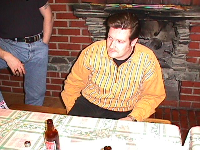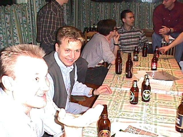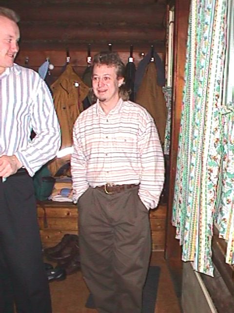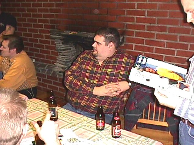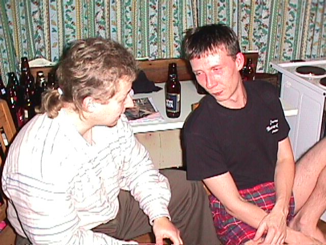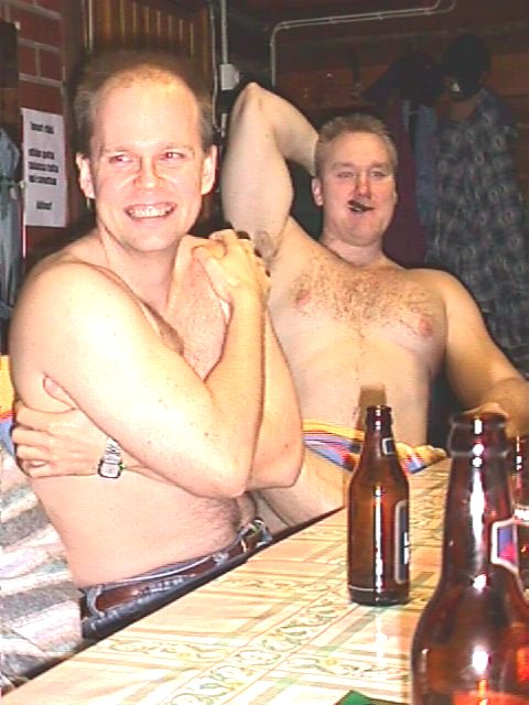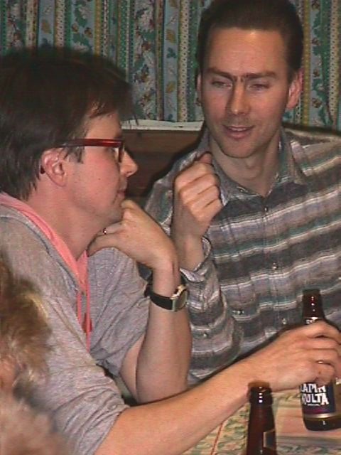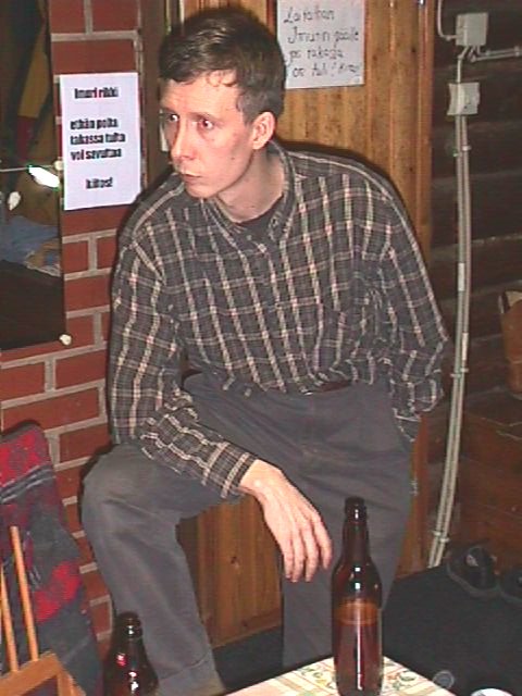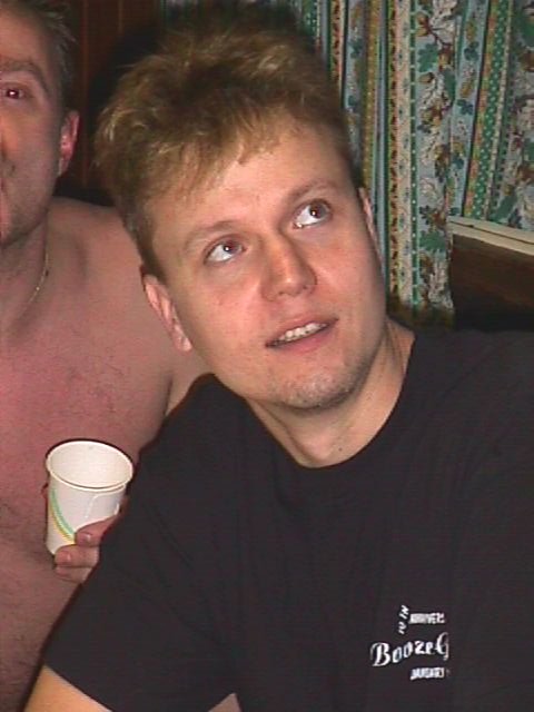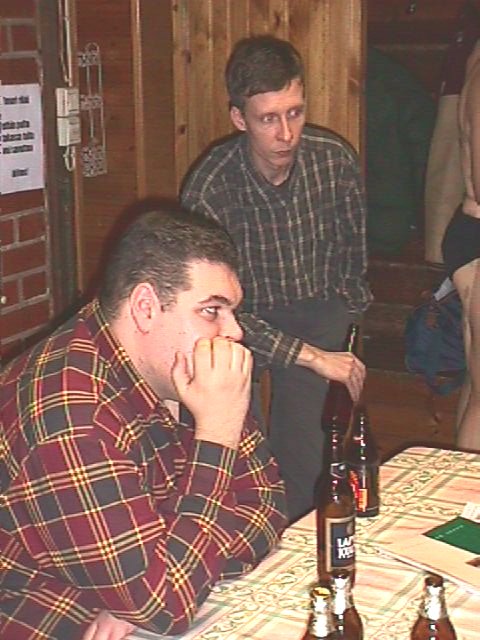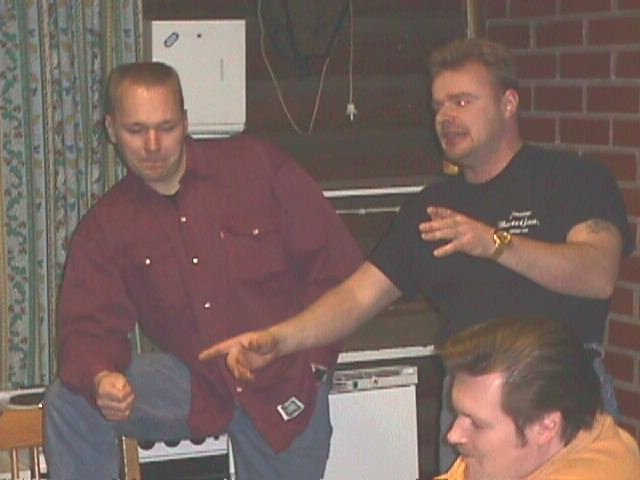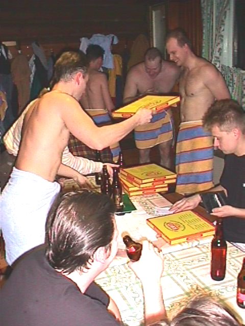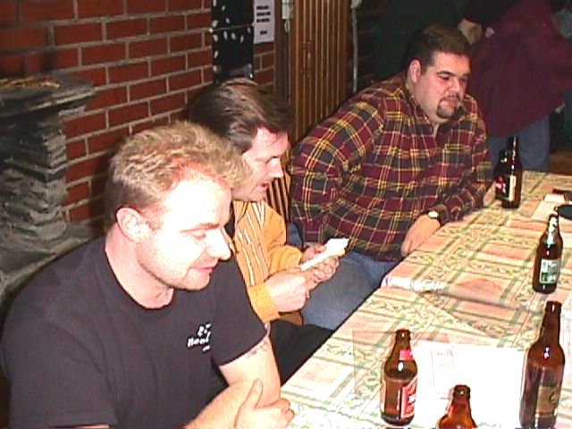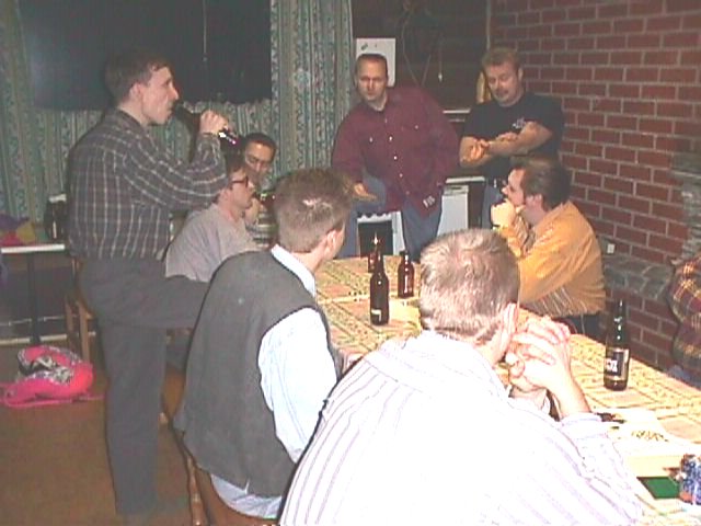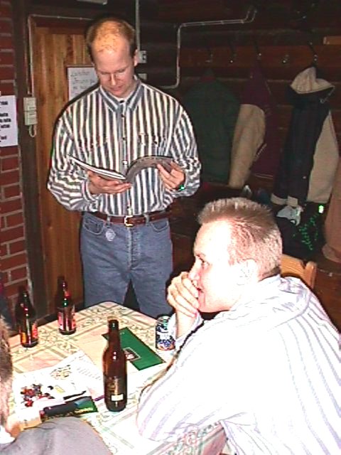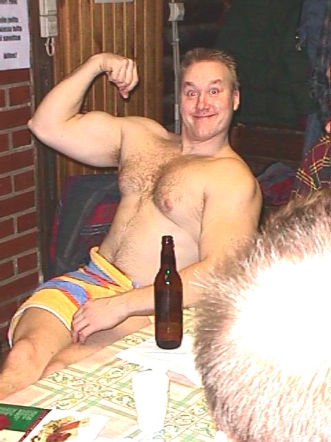 Kokouksen ensimm�isen virallisen osan aikana mietittiin vaatetilauksia... Eniten keskustelua aiheutti uuden j�senen ottaminen mukaan toimintaan Kuva 1 , -2 ja -3. Kimi & Tapi , Timppa & Kimppi , K�rri , Mako & Kaitsu , Hema & Juki sek� Tapi & Artsi joutuivat tiukkaan miettim��n BG:n j�senm��r�n kasvattamisen seurauksia. Tapi kertoo mielipiteens�. Timppa , Kimppi ja Kimi kuuntelevat. Kaitsu ja Hema naureskelevat aivan muille jutuille, mutta Juki seuraa keskustelua. Kuva 13-Kimppi ja Timppa. Kuva 14-Kaitsu. Kuva 15-K�rri. Kuva 16-K�rri ja Juki. Kuva 17-Tatska ja BG 10v. paita. Kuva 18-Juki. Kuva 19-Artsi. Lopulta ��nestystulos oli selv� 8-2 yksi tyhj� ja uusi j�sen Vesku p��si sis��n. Ulkona Tuusulanj�rven rannassa tuuli kylm�sti, eik� tikanheitto ole ulkoilulaji, ainakaan talvella. Aivan erikoisen kameran l�hikuvasta n�kee, ett� itse piru alkaa puskemaan pintaan Jukissa ja Kimiss�, eik� kello ollut viel� kuutta. Olemattoman esityslistan seuraava asia, tulevan toiminnan suunnittelu? Risteily ja t�ll� kertaa Tallinnaan, lankesi uuden j�senen hoidettavaksi Kuva 23 , -24 , -25 ja -26. Ensimm�iset p��siv�t jo PPL:n toiseenkin p��asiaan, eli saunomiseen. Tapi poseeraa ja huoneen pimeimm�ss� nurkassa piru odottaa oikeaa hetke� iske�. Ensimm�isen� Kimpille tuli n�lk� (yll�tys,yll�tys) ja kulovalkean tavoin se tarttui muihinkin. Timppa tilaa pizzat.Kimppi sek� Tapi varmistaa, ettei mit��n unohdu! Kaitsu menossa saunaan, kun velipoika on jo.. Kokous jatkui vedonly�nnill� Naganon mitaleiden m��r�st� Kuva 33. Veskulla on hauskaa kun Kaitsu l�mmitt�� kultaansa. Kimppikin innostui poseeraamaan, mutta onneksi pizzakuski Eero saapui ennen totaalista sekoamista. N�lk�isen�kin BG:n porukalta ruoan jakelu sujuu t�yden sekasorron vallitessa. Kimppi ja Timppa n�ytt�v�t sy�misen mallia, mutta Artsi keskittyy nestemm�iseen. Limppu suunnisti saunalle hajun (tai metelin) perusteella ja joutui heti selostamaan syyn my�h�stymiseen?! Majurin tarjoama konjakki riitti.. Kimi ja Limppu j��hdyttelev�t. Kaitsu n�ytt�� juomisen mallia. Kimppi on jo valmis illan rientoihin kun K�rri alkaa vasta p��st� vauhtiin. Hema on onnellisen tiet�m�t�n takana vaanivasta, pirun valtaamasta Tapista, joka on my�s naturisti. Kimi & Timppa sek� Vesku & Juki keskustelevat henkevi�, kun Kaitsu harjoittelee iltakerhoa varten repliikkej��n.. Poliitikkojen kehu-kehu-min�-min� puheiden veroisten esitysten saattelemana, suoritettiin vuoden Booze Gangil�inen (lue - k�nnil�inen) ��nestys: Vuoden Booze Gangil�inen Tapi iloitsee valinnastaan! K�denv��nt�kisan j�lkeen Kaitsu esittelee hauistaan ja Makolla on hauskaa, vaikkakin joutui j��m��n... ainakin toiseksi. Koko porukka pakotettin poseeraamaan, jotta kotisivulle saataisi edes yksi asiallinen kuva, mutta ei siit�k��n mit��n tullut! Kuvasta puuttuu paikalla olleista Vesku (kuvaaja) ja aikaisemmin poistunut Artsi. Lopullisessa laskennassa todettiin suurella todenn�k�isyydell�; Sipin, �ss�n ja Zilun j��neen ilmaantumatta paikalle. T�ss� vaiheessa ainakin digitaalikamerasta meni filmi poikki, joten lis�� kuvia on luvassa vasta seikkailusarjan seuraavassa osassa.. |